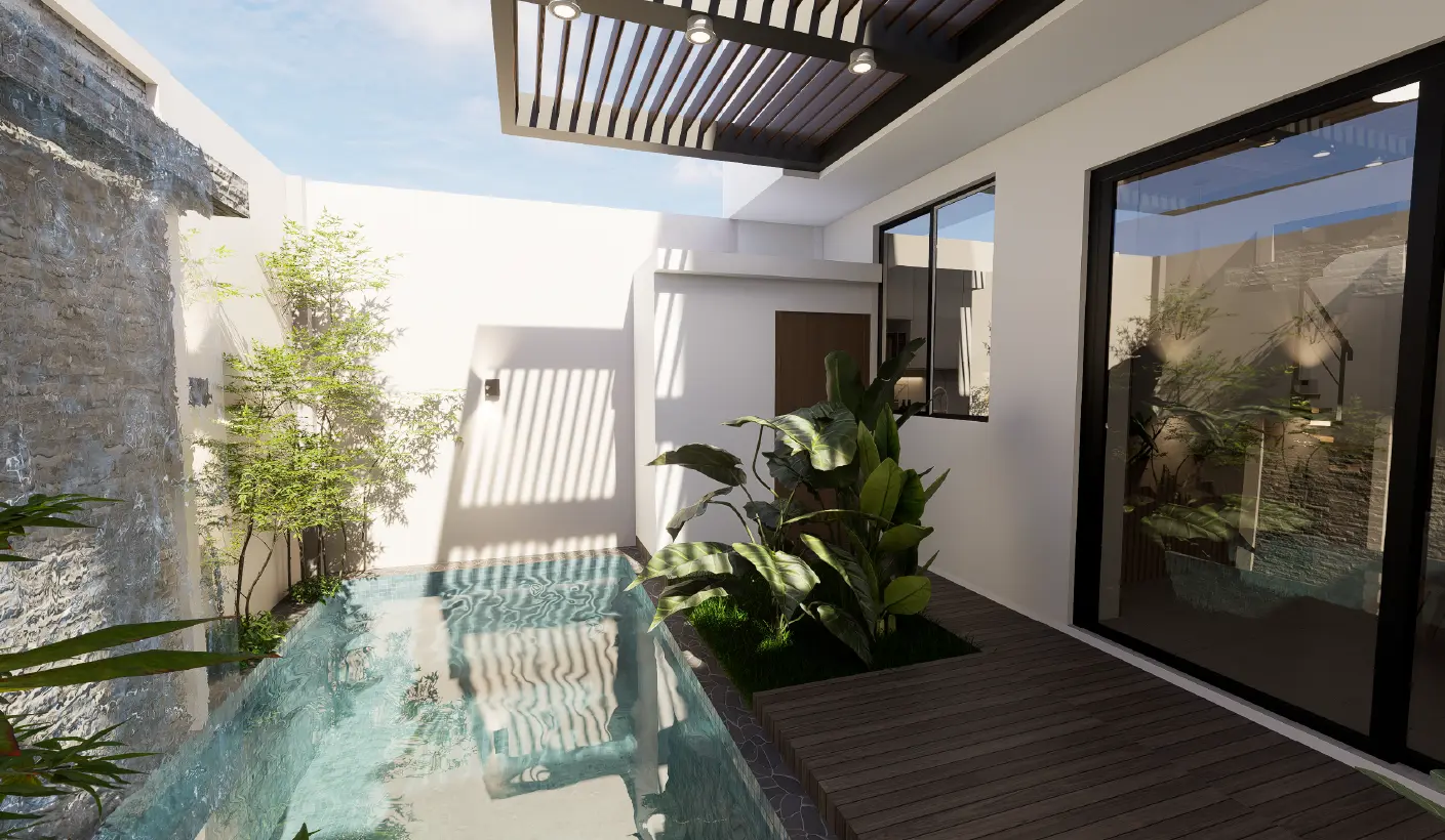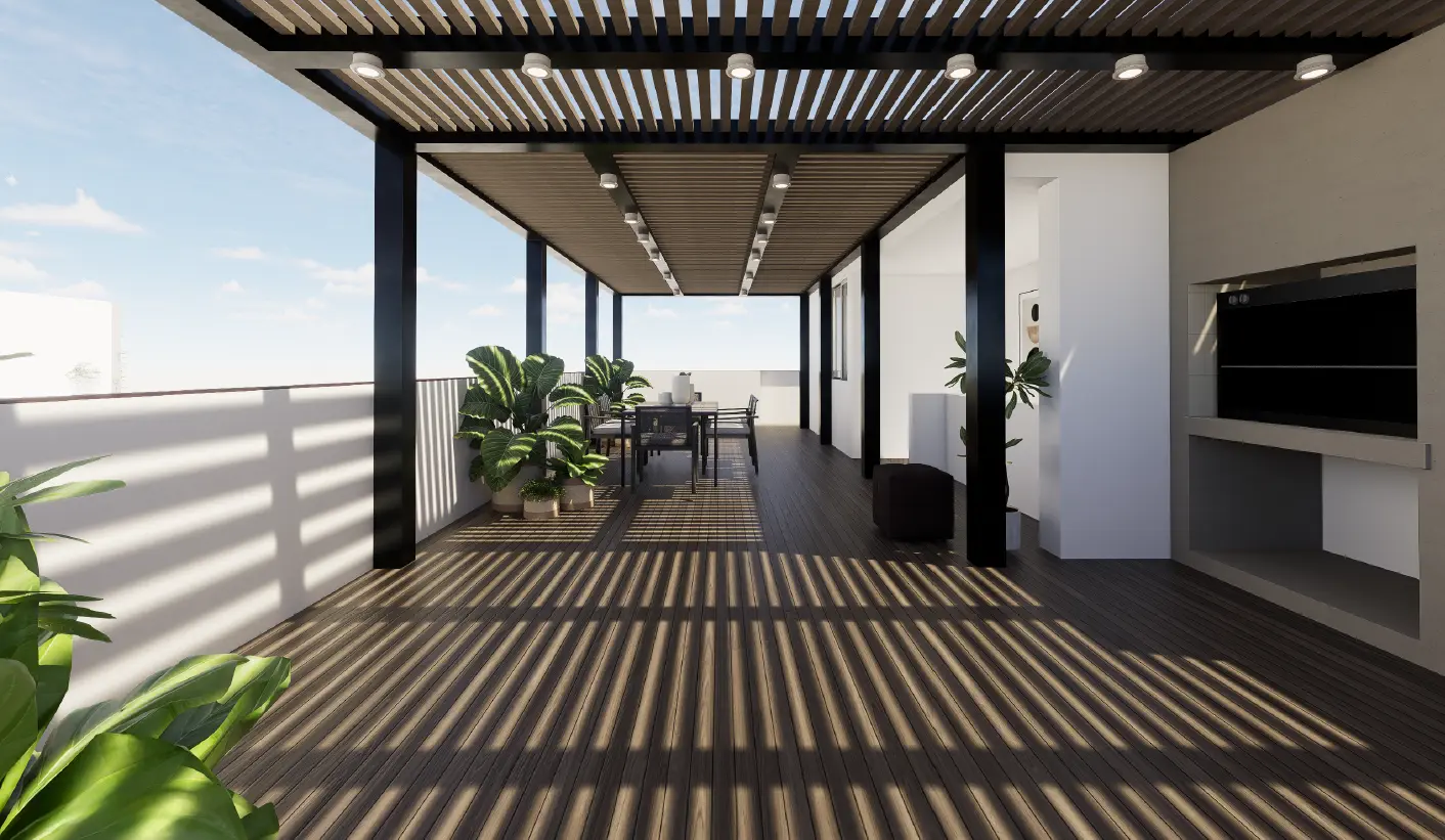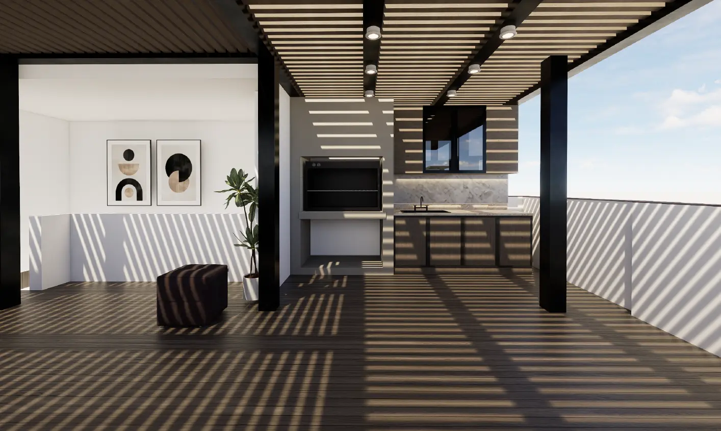 Además, integramos dentro del diseño los muebles y elementos que el cliente ya tenía de su departamento anterior, ubicándolos correctamente para que sigan siendo parte del nuevo espacio. Se plasmó el diseño del mueble de cocina, el área de piscina y una terraza, pensada según el tipo de actividades que el cliente iba a realizar en ese ambiente.