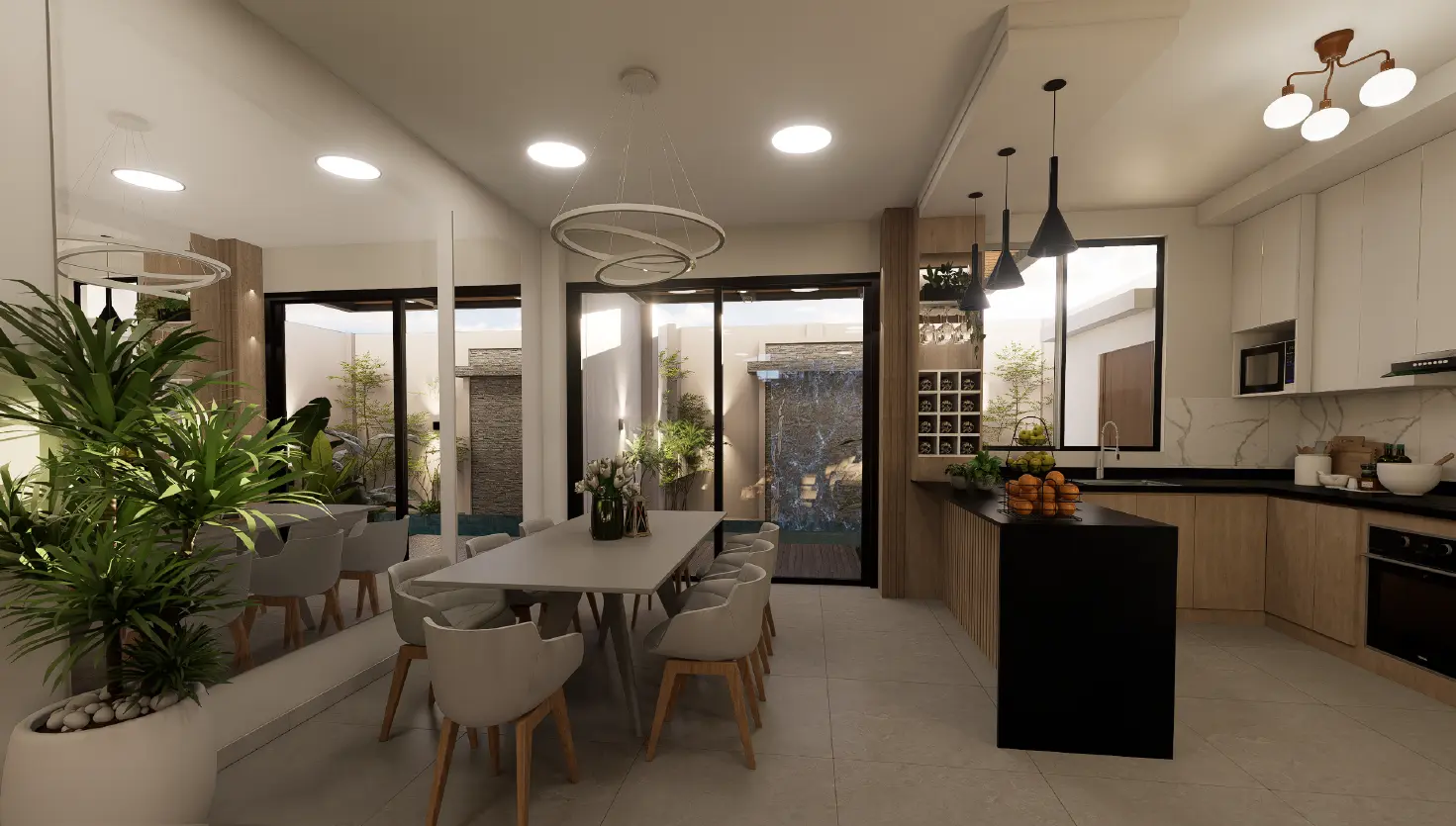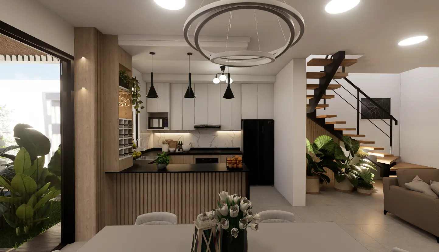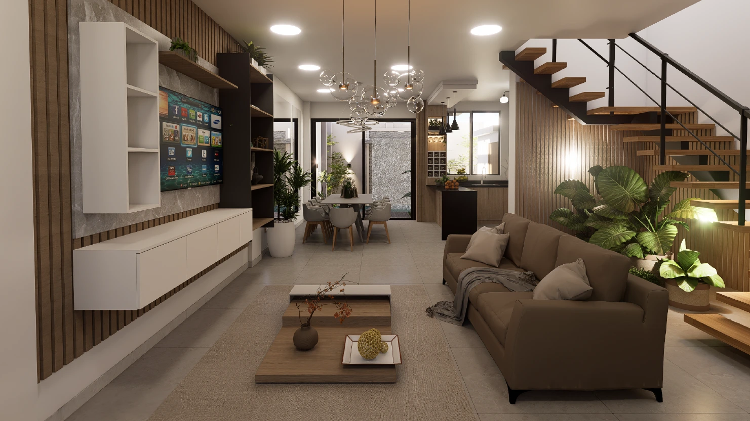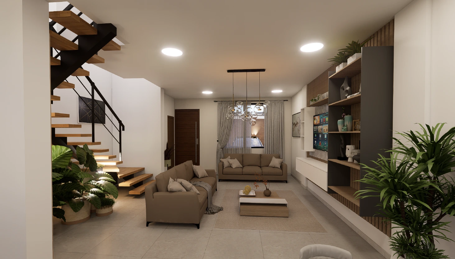 Nuestra propuesta fue desarrollar el diseño de interiores completo, contemplando desde el inicio el tipo de puertas, acabados, colores, iluminación y mobiliario, buscando que todo tenga coherencia y fluya como un solo espacio.