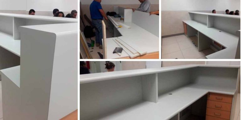 Counter de recepción para clínica: fabricación e instalación de mueble interior y tablero postformado. Proyecto para atención al cliente.
